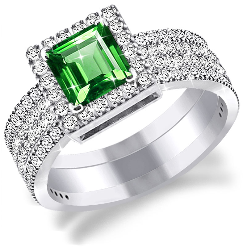1 Carat center Emerald. This ring consist of 2 Row Center Ring and 2 single removable row bands. All Diamonds total to 1.75 Carats.