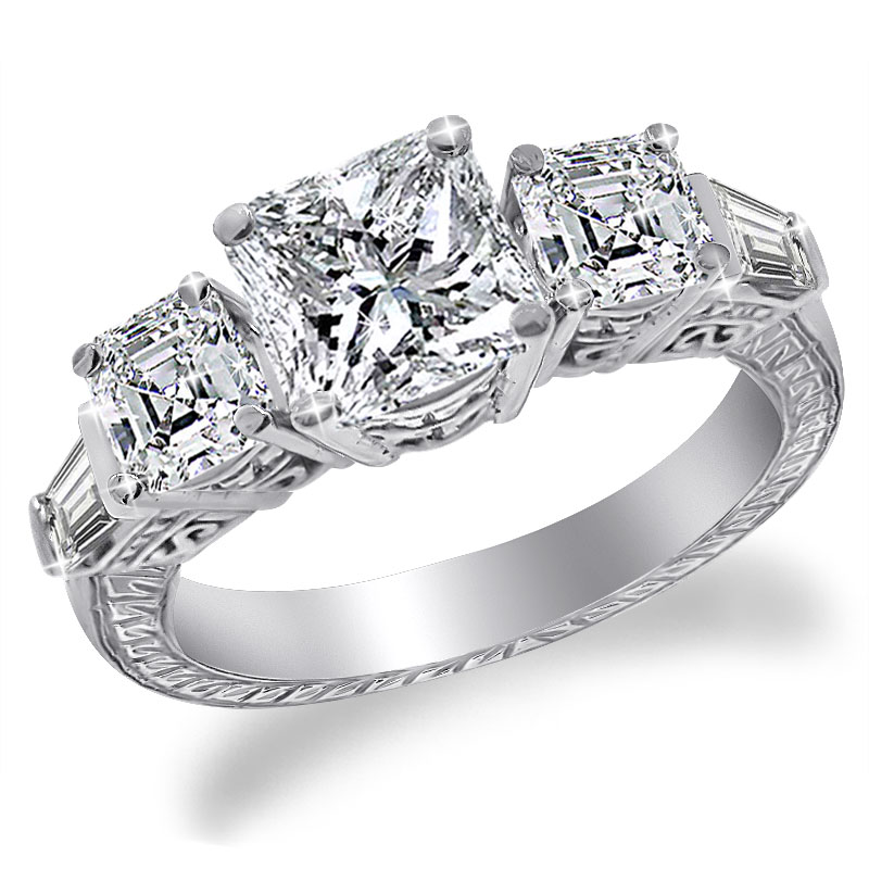 With 2 Asscher Diamonds 0.60p tcw and 2 baguettes 0.30p tcw.