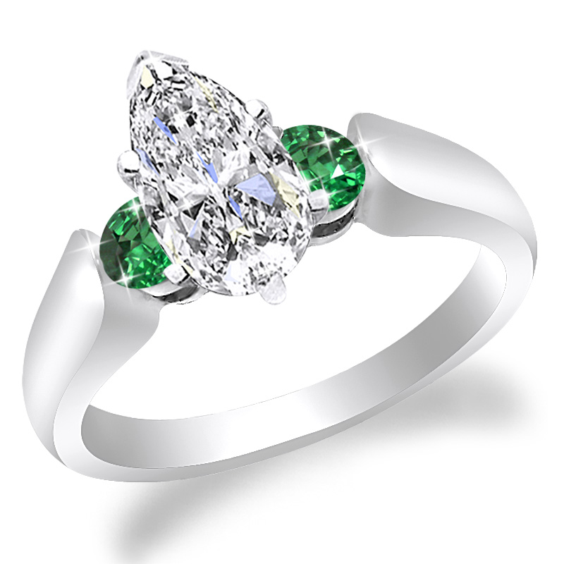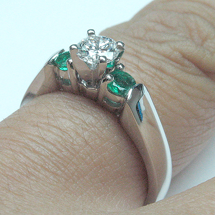 With 2 round Emerald as side stones 0.30 tcw. Any shape and carat size of center Diamond can be placed. Choose your prong style.