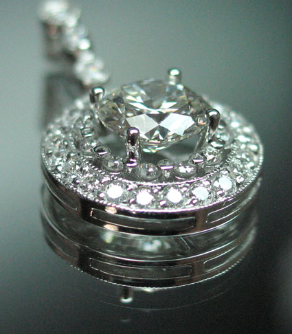 with a circular setting surrounded by two rows of diamonds. Bail has 5 round diamonds.(Box Chain Included)