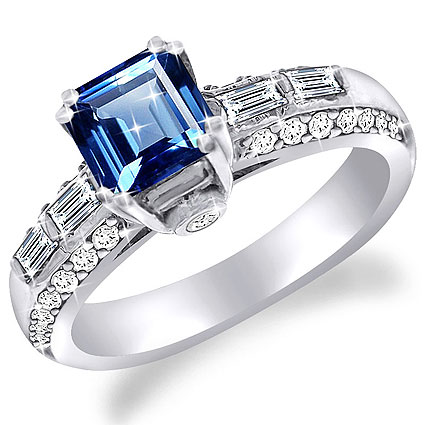 Double prong for center Stone. Accented with 4 Baguettes 0.30 tcw & 2 bezel set brilliants 0.10 tcw & pave set brilliants 0.35 tcw.