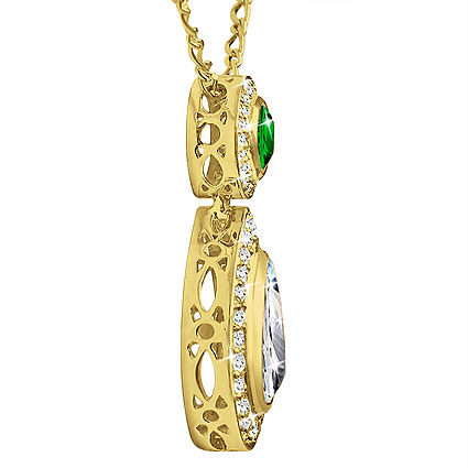 Round center stone is an emerald 0.30 carat and center pear shape Diamond is 1 Carat. Pave diamonds totals to 0.30 carats.