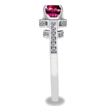 With bezel frame and ring shoulder surrounded by diamonds totaling of 0.65 Ct and a sparkling Ruby center stone 1 Ct.