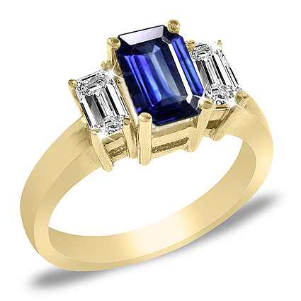 3 stone 14K gold ring. 1.5 Ct Emerald-cut Natural Sapphire center stone and 2 emerald-cut Diamond sidestones tcw 0.85.