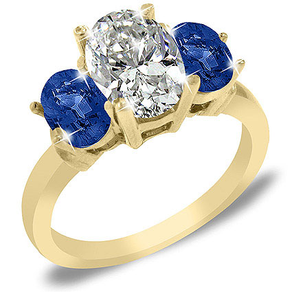 1 Carat Oval Diamond as center stone and 2 oval Sapphire as side stones 1.10 tcw. Stones set in four prong 14K Gold Setting.