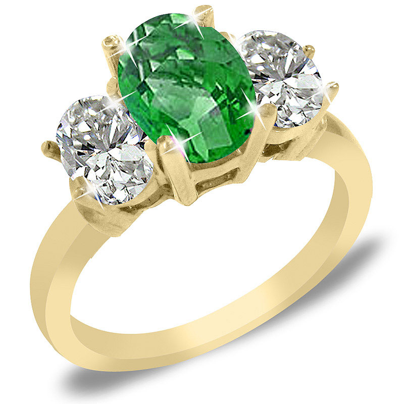 with 4 prong design to hold each stone. With Oval cut Emerald center stone 1.6 Ct and 2 oval Diamonds as side stones 0.80 tcw. Stones set in four prong 14K Gold Setting.