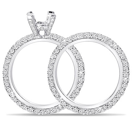 Wedding Set: Rounded Band Ring Setting with Three Row Pave set Diamonds in 14K Gold. Comes with a matching band.
