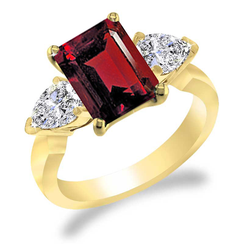 Basket prong ring with 1.25 Ct Emerald shape Ruby and Pear Cut Diamonds ~2 pear